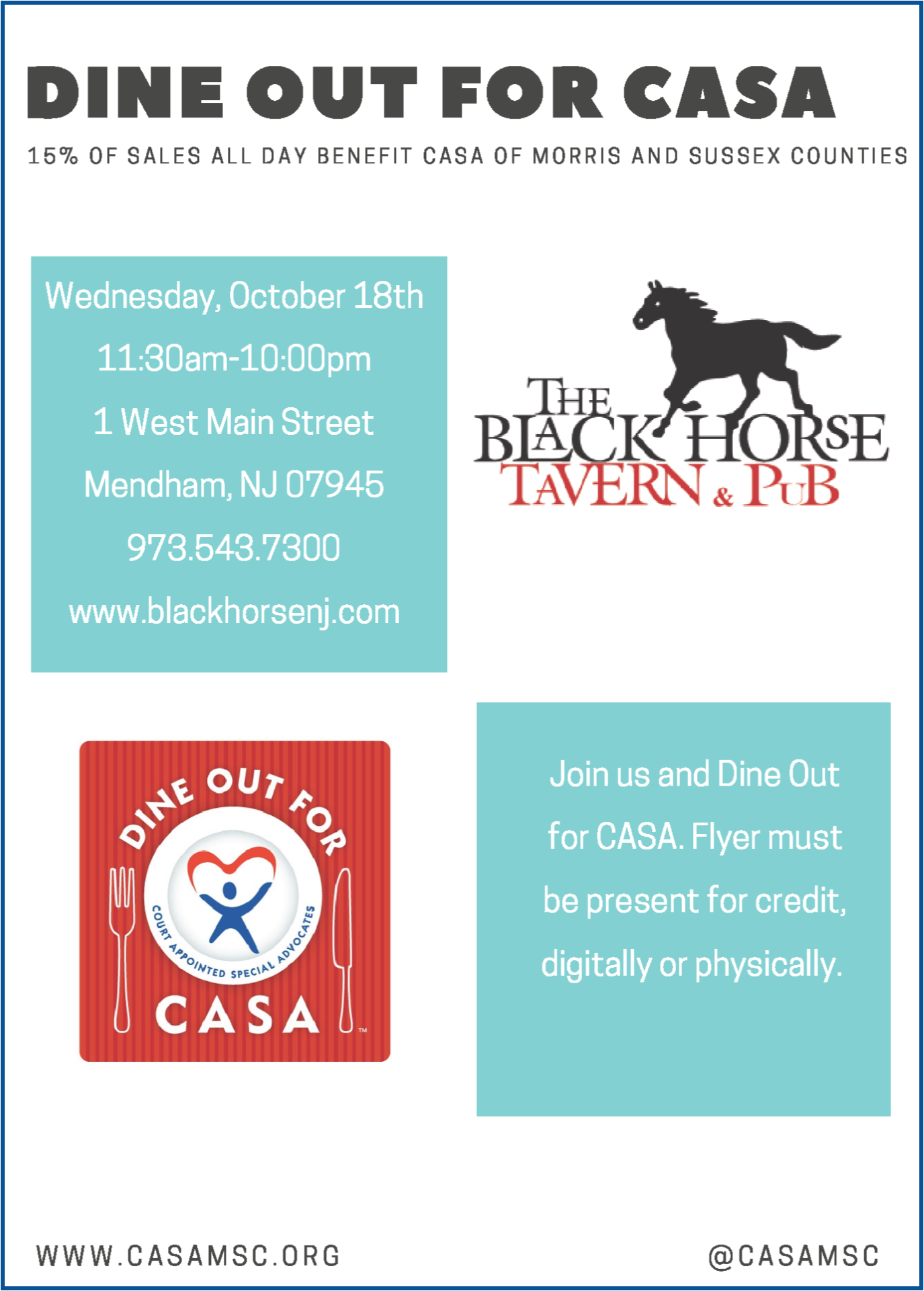Join us and Dine Out for CASA. 15% of sales all day will benefit CASA of Morris and Sussex Counties. Flyer must be presented for credit, physically or digitally. Bring your family and friends and support CASA!